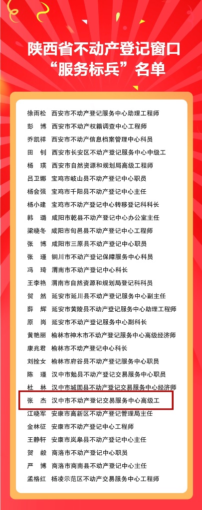 自2015年汉中不动产登记交易服务中心成立以来,张杰同志一直扎根不动产登记房地产权登记窗口,深耕业务底层逻辑,热情服务企业群众,积极参加上门服务,以精湛的业务技能和无私的服务热忱赢得了企业群众的一致好评。多次被市局机关党委评为“优秀共产党员”,成为了群众眼中的“最美登记人”。